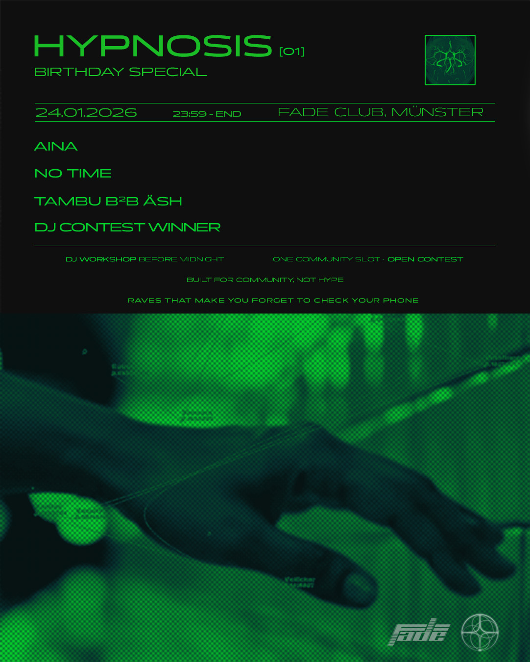 On January 24th, 2026, we take over Fade Club for a special edition. HYPNOSIS – Birthday Special Not driven by headliners or hype, but by music that pulls you in and lets you lose yourself. HYPNOSIS brings together hypnotic, groovy, driving, hard and trancy techno. Emotional, immersive and built for real moments on the dancefloor. […]